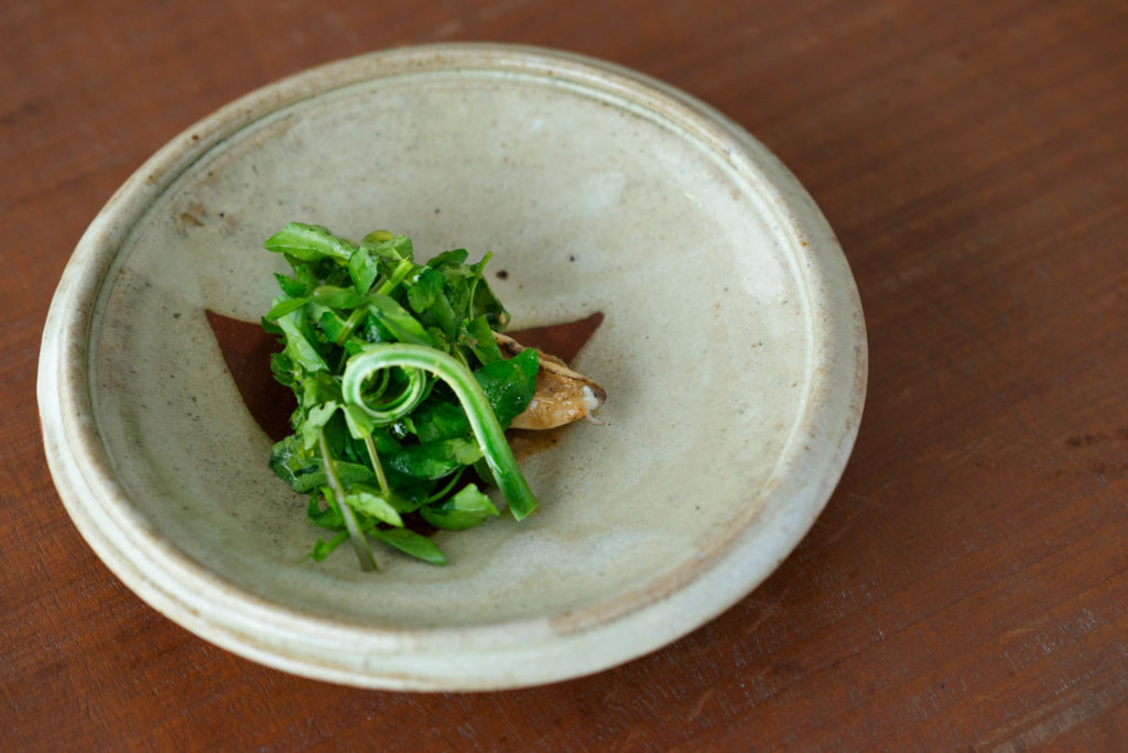 Ezo abalone slow-cooked for 3 hours is served with watercress in a warm salad.